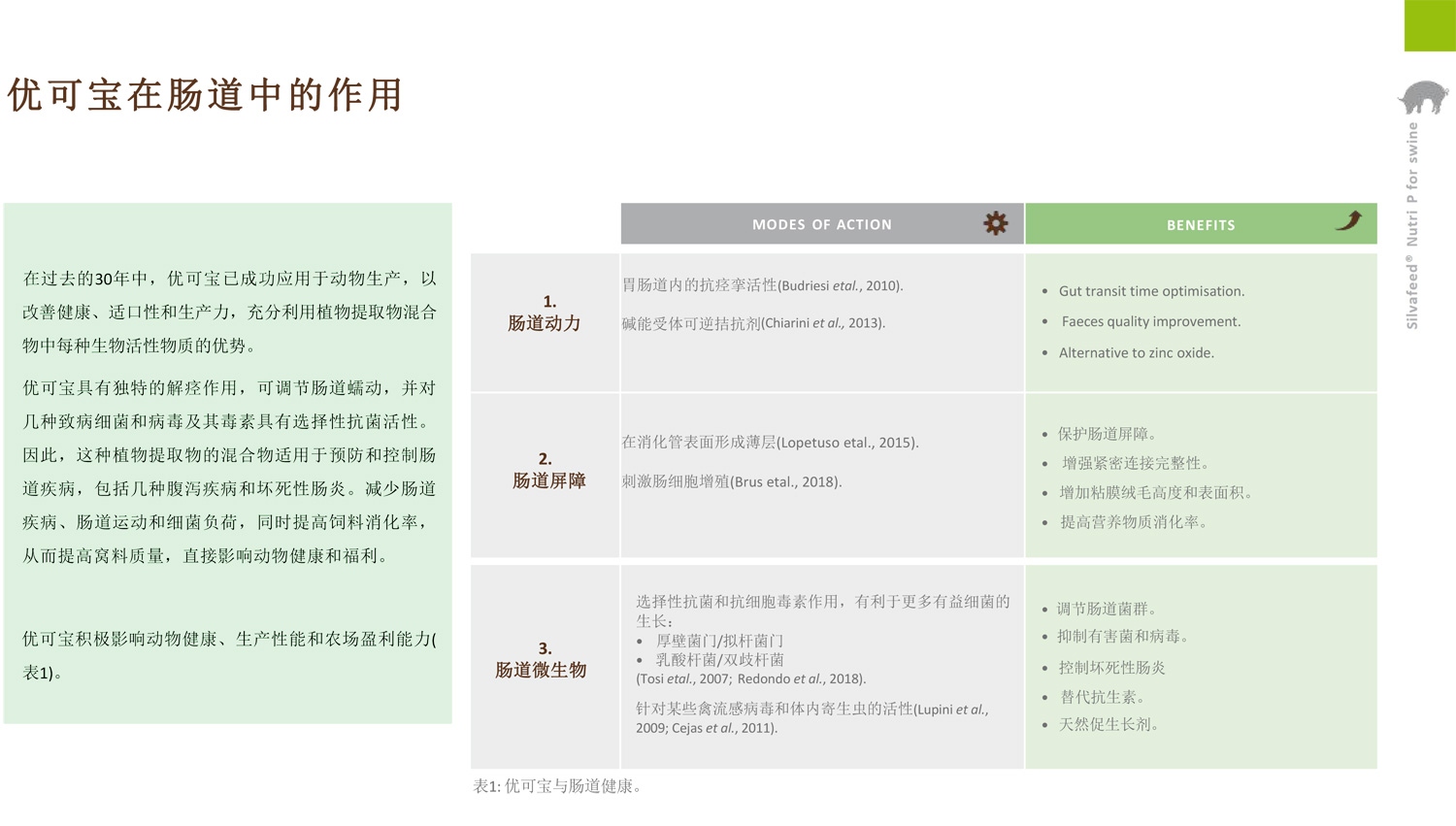 優可(kě)寶具(jù)有(yǒu)獨特的解痙作(zuò)用(yòng),可(kě)調節腸道蠕動,并對 幾種緻病細菌和病毒及其毒素具(jù)有(yǒu)選擇性抗菌活性。 因此,這種植物(wù)提取物(wù)的混合物(wù)适用(yòng)于預防和控制腸 道疾病,包括幾種腹瀉疾病和壞死性腸炎。